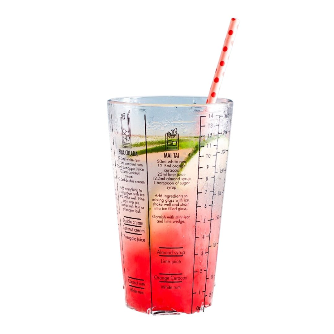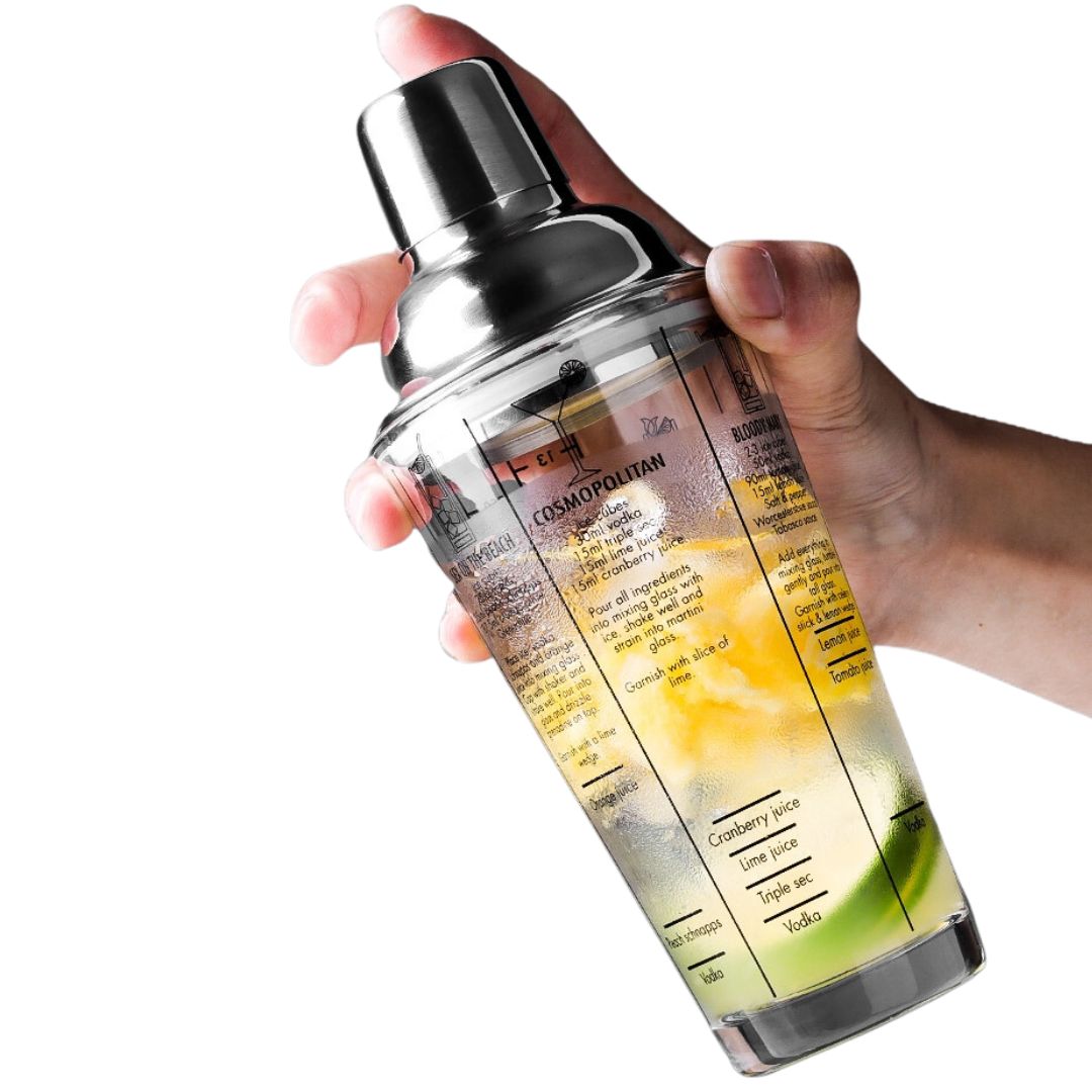 Mix up a modern concoction with this stylish, multifunctional cocktail set. Crafted with a stainless steel shaker with recipes printed on the cocktail shaker glass, and a 400 ml mixing cup - you'll be ready to make the perfect beverage in no time. Perfect for creating fruity juices, mocktails and classic cocktails with ease, this modern set is ideal for the sophisticated host or home barista.